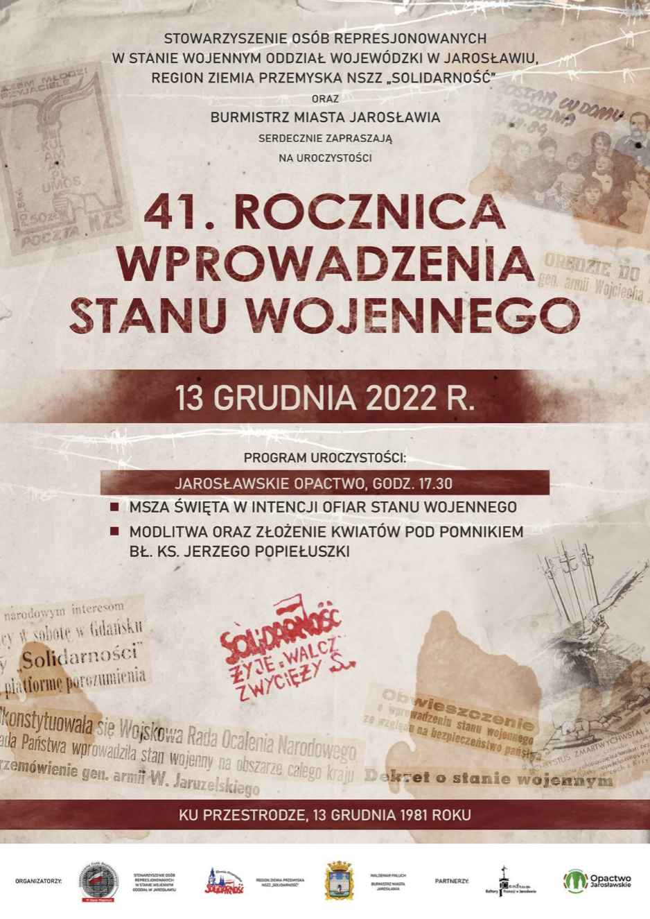 Region Ziemi Przemyska NSZZ „Solidarność”, Stowarzyszenie Osób Represjonowanych w Stanie Wojennym Oddz. Wojewódzki w Jarosławiu, Burmistrz Miasta Jarosławia zapraszają na uroczystość upamiętniającą rocznicę wprowadzenia stanu wojennego.