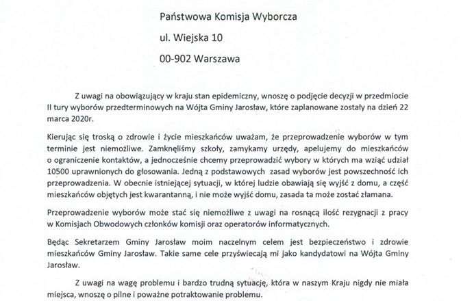 W następstwie śmierci wieloletniego Wójta Gminy Jarosław, Romana Kałamarza, doszło do przedterminowych wyborów. Pierwsza tura odbyła się 8 marca, do drugiej tury dostali się Elżbieta Grunt (2439 głosów) i Leszek Szczybyło (1861 głosów). Zgodnie z ostatnią uchwałą Gminnej Komisji Wyborczej w Jarosławiu II tura wyborów ma się odbyć 22 marca, data ta ciągle widnieje też na stronie delegatury Krajowego Biura Wyborczego. Wobec ogłoszenia stanu zagrożenia epidemicznego, zamknięcia szkół, apeli o ograniczenie poruszania się przeprowadzenie wyborów wydaje się być ryzykownym przedsięwzięciem. Uprawnionych do głosowania jest 10500 osób. List do PKW (i do wiadomości Premiera RP) na ten temat napisała startująca w wyborach Elżbieta Grunt, będąca zarazem Sekretarzem Gminy.