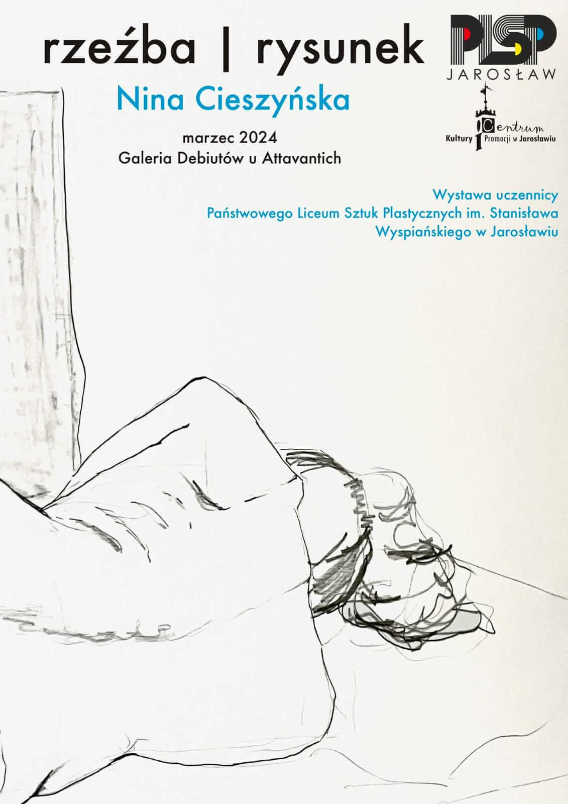 Wystawa Niny Cieszyńskiej „rzeźba | rysunek”Nina Cieszyńska Uczennica Państwowego Liceum Sztuk Plastycznych im. Stanisława Wyspiańskiego w Jarosławiu prezentuje swoje prace w Galerii Debiutów u Attavantich. Czas trwania wystawy: Marzec 2024