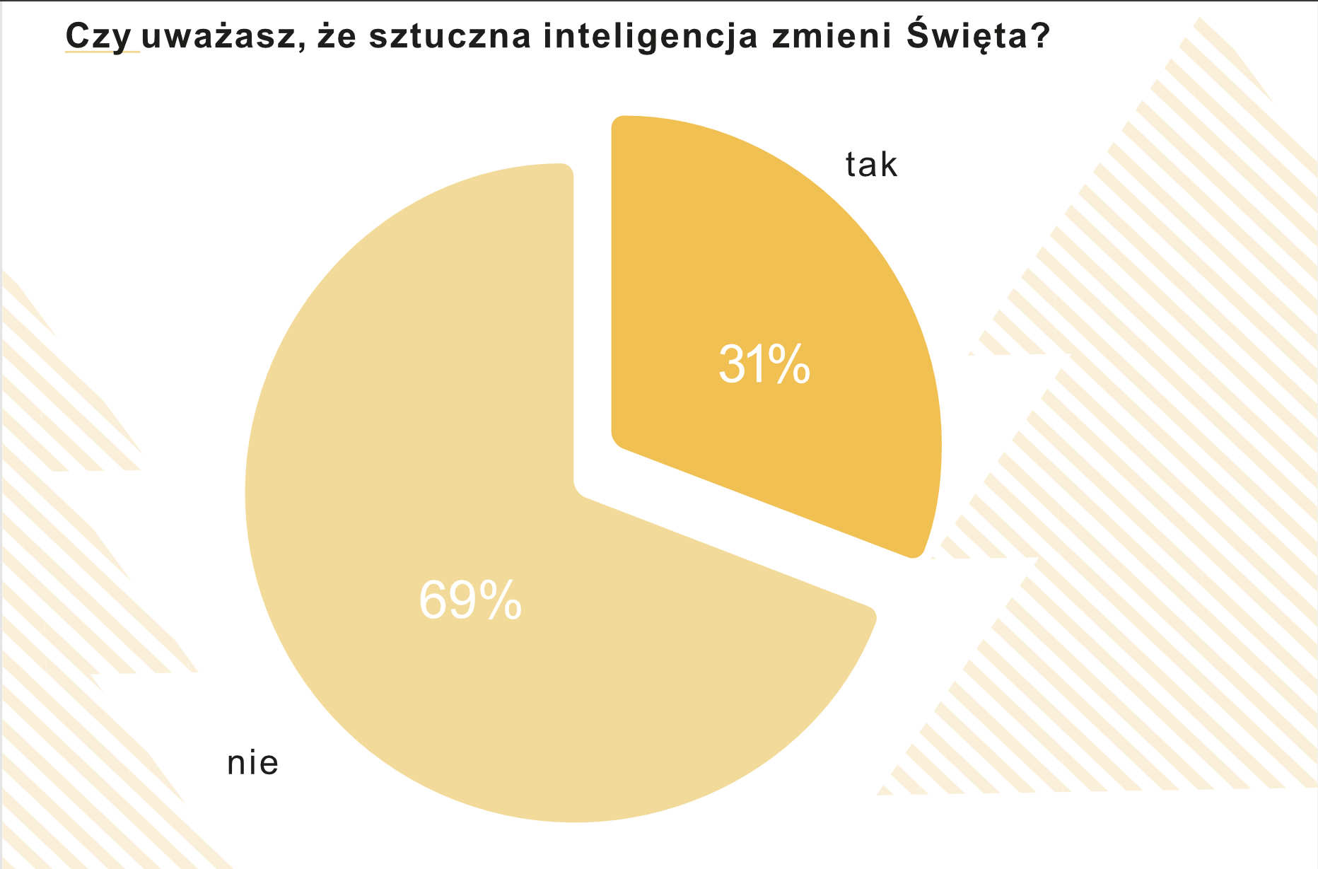 Z badania serwisu Prezentmarzeń “Jak sztuczna inteligencja zmieni Święta Bożego Narodzenia” w której udział wzięło 1496 osób, wynika, że sztuczna inteligencja zmieni Święta Bożego Narodzenia. Ponad 60% respondentów stwierdziło, że w przyszłości wzrośnie w nas potrzeba bliskości, będziemy poszukiwać okazji do spędzania czasu z bliskimi, a celebrowanie uroczystych spotkań zacznie być ważnym elementem życia społecznego. Zdaniem co trzeciej osoby święta dla niektórych będą jeszcze trudniejszym czasem, czasem głębokiej samotności, a co czwarta uważa, że będą ważnym okresem bliskich relacji, których jest coraz mniej. Tylko jedna osoba na dziesięć myśli, że w czasach sztucznej inteligencji święta przestaną być ważnym elementem życia społecznego.