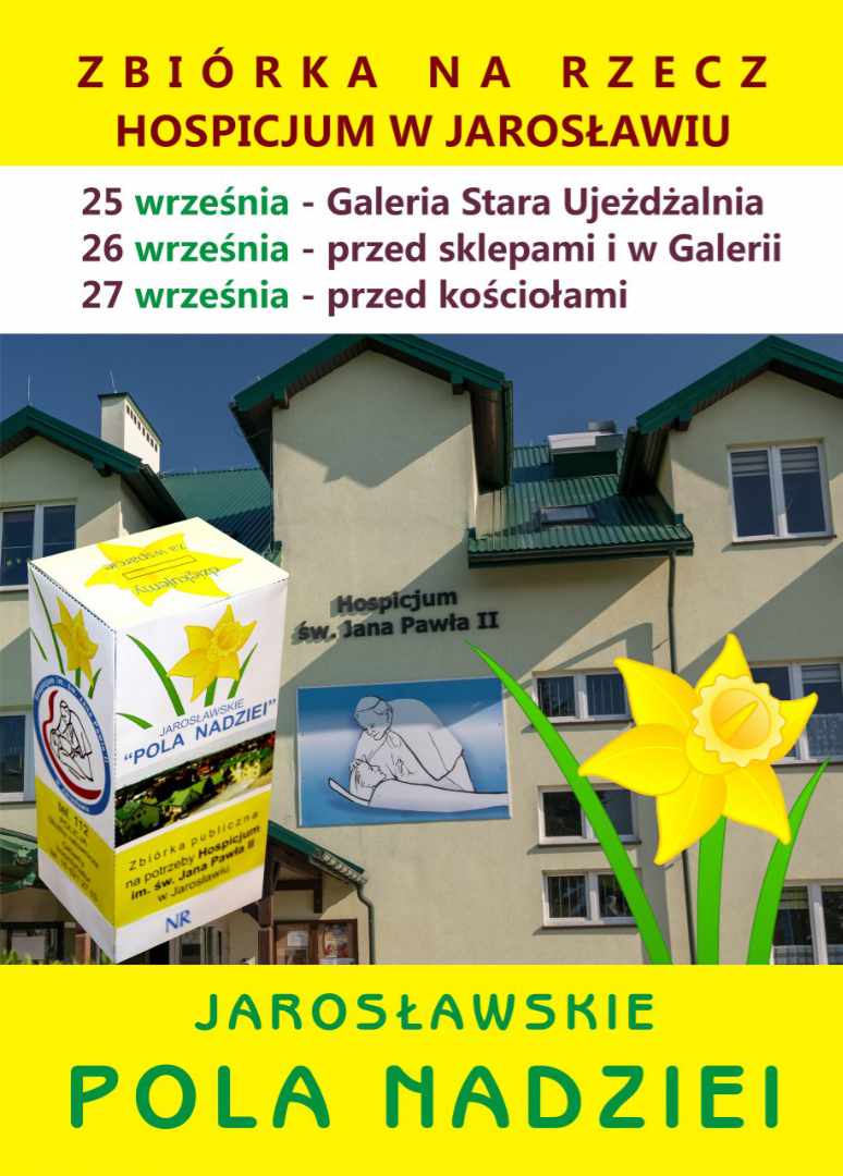W sobotę 26 września przed sklepami, a w niedzielę 27 września przed kościołami odbędą się Jarosławskie Pola Nadziei. Publiczna zbiórka pieniężna na rzecz Hospicjum im. św. Jana Pawła II w Jarosławiu dla wsparcia ciężko chorych w tym domu ulgi w cierpieniu.