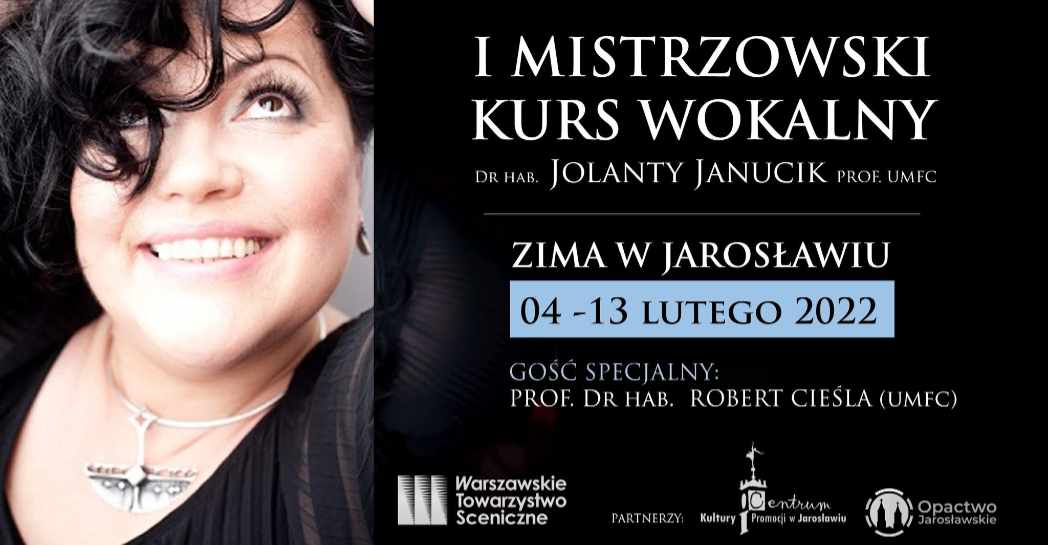 Już 4. lutego 2022 rozpocznie się „I Mistrzowski Kurs Wokalny dr hab. Jolanty Janucik prof. UMFC – „ZIMA W JAROSŁAWIU”. Warszawskie Towarzystwo Sceniczne we współpracy z partnerami: Centrum Promocji i Kultury w Jarosławiu oraz Opactwem Jarosławskim, ma przyjemność być organizatorem tego wydarzenia. Przez ponad tydzień, swoje klasy śpiewu poprowadzą znakomici pedagodzy Uniwersytetu Muzycznego Fryderyka Chopina w Warszawie: dr hab. Jolanta Janucik prof. UMFC – inicjatorka i dyrektorka artystyczna wydarzenia – oraz zaproszony przez prof. Janucik gość specjalny – prof. dr hab. Robert Cieśla. Podczas kursu profesorom będą towarzyszyły dwie utytułowane pianistki: Małgorzata Zajączkowska – Warsza oraz Yan Rong. Kurs zostanie uwieńczony dwoma koncertami uczestników 11 i 12 lutego br., w Sali Lustrzanej Centrum Promocji i Kultury w Jarosławiu oraz w Opactwie Jarosławskim. Szczegóły wydarzenia na www.kursjaroslaw.org