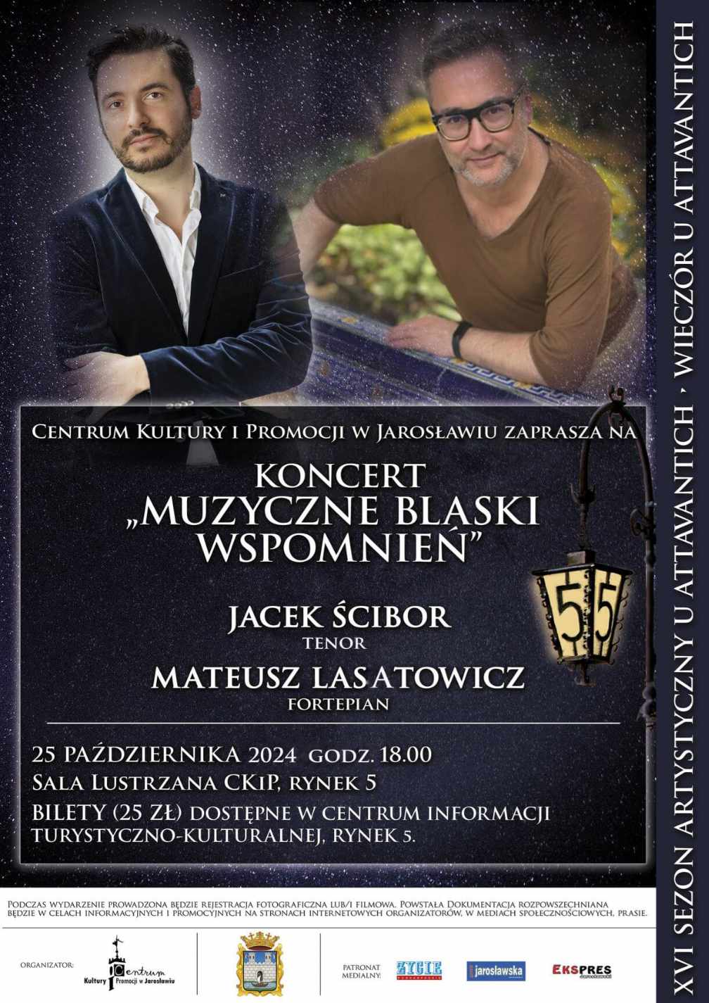 Centrum Kultury i Promocji w Jarosławiu zaprasza na koncert „Muzyczne blaski wspomnień” Wykonawcy: Jacek Ścibor – tenor Mateusz Lasatowicz – fortepian 25 października 2024, godz. 18.00 Sala Lustrzana CKiP w Jarosławiu (u. Rynek 5) Bilety w cenie 25 zł do nabycia w Centrum Informacji Turystyczno-Kulturalnej.