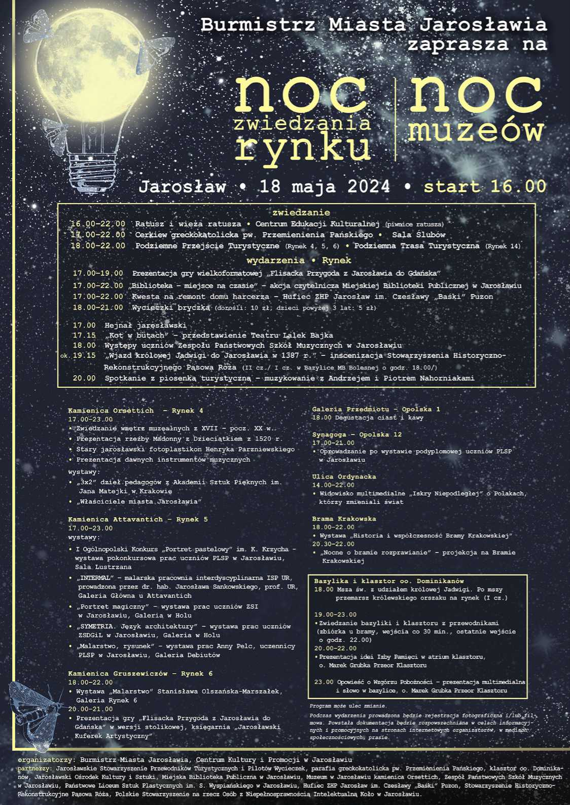 Zapraszamy na wyjątkową Noc Zwiedzania Rynku w Jarosławiu, która odbędzie się 18 maja. To niepowtarzalna okazja, aby odkryć uroki miasta i zwiedzić miejsca na co dzień niedostępne, takie jak wieża ratusza, cerkiew pw. Przemienienia Pańskiego, czy klasztor oo. Dominikanów. W programie znajdą się również wycieczki bryczką, występy artystyczne, spektakle teatralne, koncerty oraz liczne wystawy. Startujemy o godzinie 16:00, a wydarzenia będą trwały do późnego wieczora.