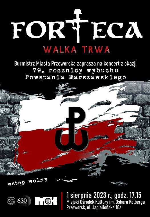 Obchody 79 rocznicy wybuchu Powstania Warszawskiego – Miejski Ośrodek Kultury Przeworsk na koncert zespołu FORTECA. 1 sierpnia 2023, godz. 17.15. MOK Przeworsk, ul, Jagiellońska 10a