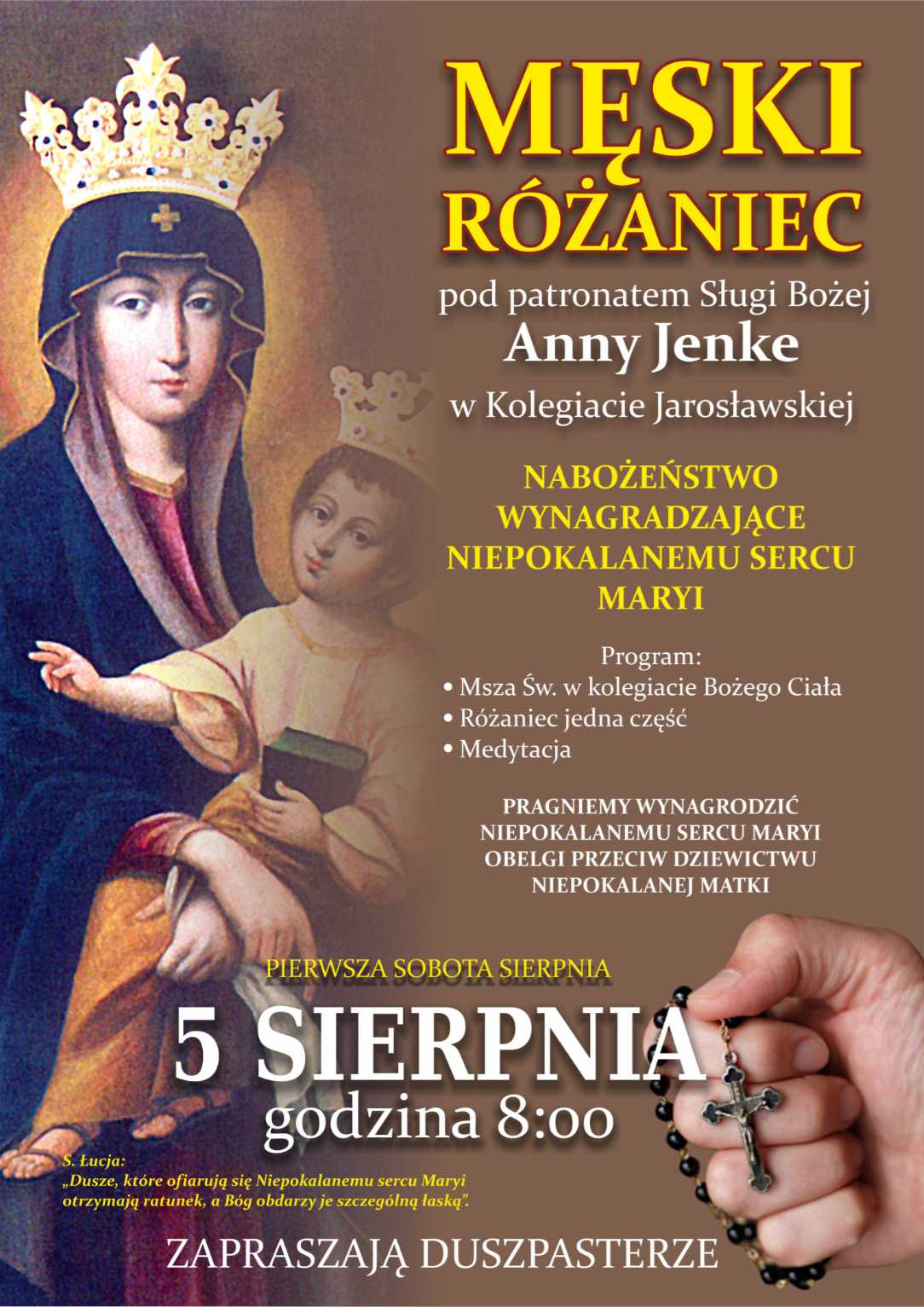 W Kolegiacie Bożego Ciała Męski Różaniec w Jarosławiu w każdą pierwszą sobotę miesiąca. *** Opactwo - Kościół św. Mikołaja i św. Stanisława. W pierwszą sobota miesiąca:Nabożeństwo wynagradzające Niepokalanemu Sercu Maryi- 9:15- medytacja, 9:30- różaniec, 10:00 -Msza św. Zobacz - Msze w jarosławskich kościołach