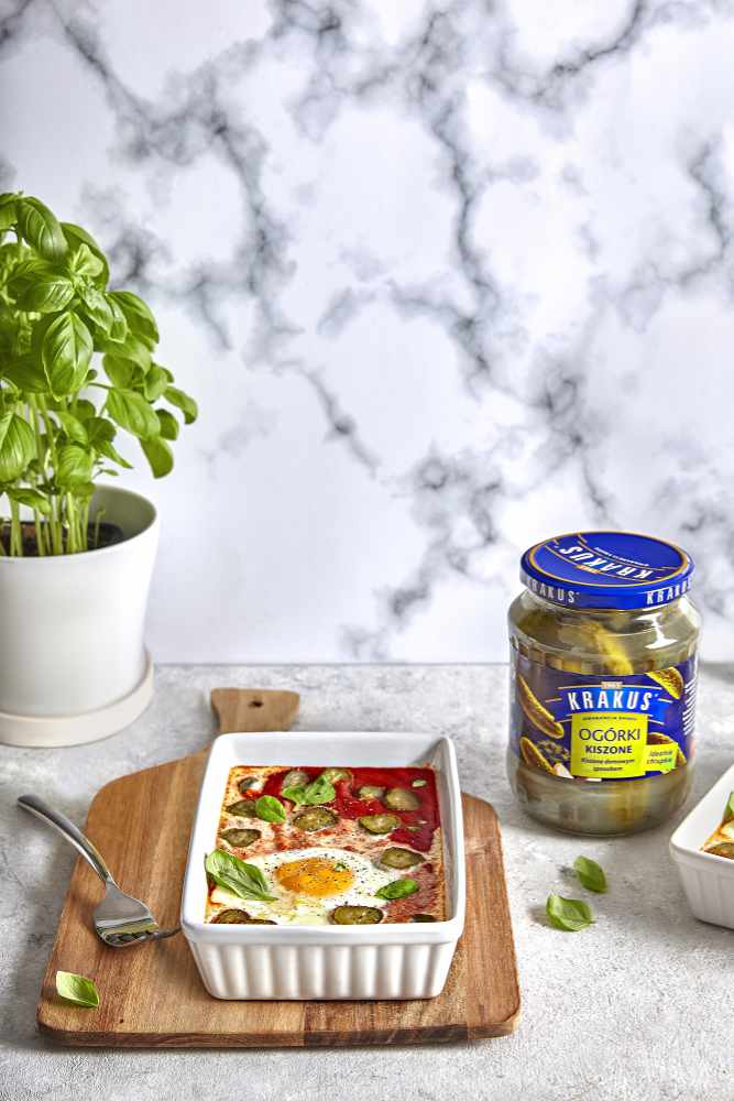 Przepis nr 2: Jajka zapiekane z Passatą Łowicz z Ogórkami Kiszonymi Krakus