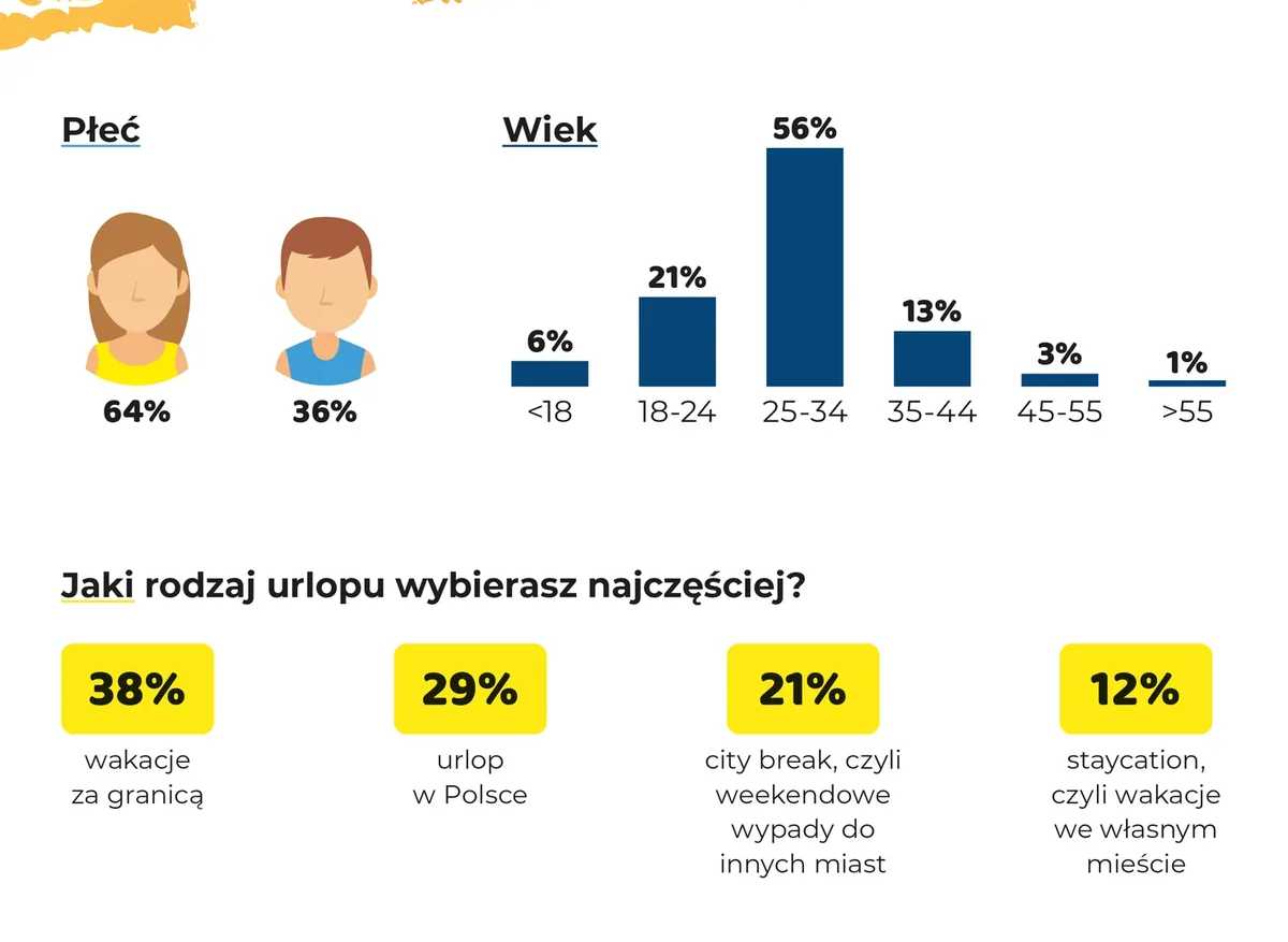 Zdecydowana większość potrzebuje odpoczynku i wykorzystuje od 8 do 14 dni (43%). Wiele osób wyjeżdża również na urlop do 7 dni (28%) oraz powyżej 14 dni (16%). Co trzeci Polak wakacje jednak najczęściej organizuje samodzielnie. 29% respondentów wskazało, że chętnie bierze udział w zorganizowanym wyjeździe przez znajomych lub rodzinę. Niektórzy również przygotowują wyjazd sami (21%). Jedynie 18% ankietowanych wskazało, że kupuje wyjazd w biurze turystycznym. Urlop najczęściej spędzamy z partnerem lub partnerką (38%), z przyjaciółmi i znajomymi (29%), z rodziną (21%). Na samodzielny wyjazd decyduje się jedynie 12% osób.