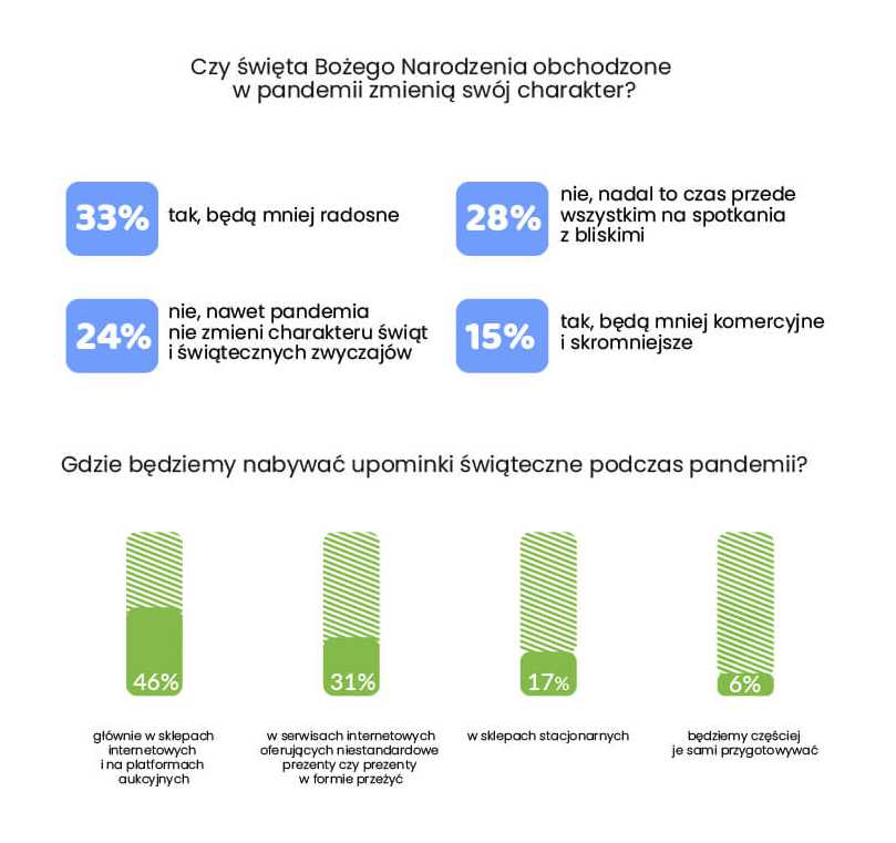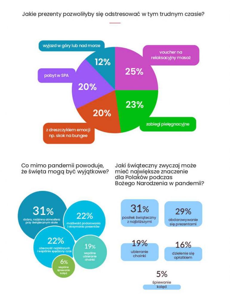 Jak wynika z deklaracji 54% respondentów badania „Święta w czasie pandemii COVID-19” największą część świątecznego budżetu mimo pandemii przeznaczymy na prezenty dla bliskich.Według co trzeciego Polaka tegoroczne święta niezależnie od sytuacji wywołanej przez koronawirusa mogą być wyjątkowe, dzięki dobrej, rodzinnej atmosferze przy świątecznym stole. Wśród zwyczajów, mających największe znaczenie w trakcie zbliżającego się Bożego Narodzenia obchodzonego w pandemicznym roku, Polacy wskazują na świąteczny posiłek z najbliższymi i obdarowywanie się prezentami.
