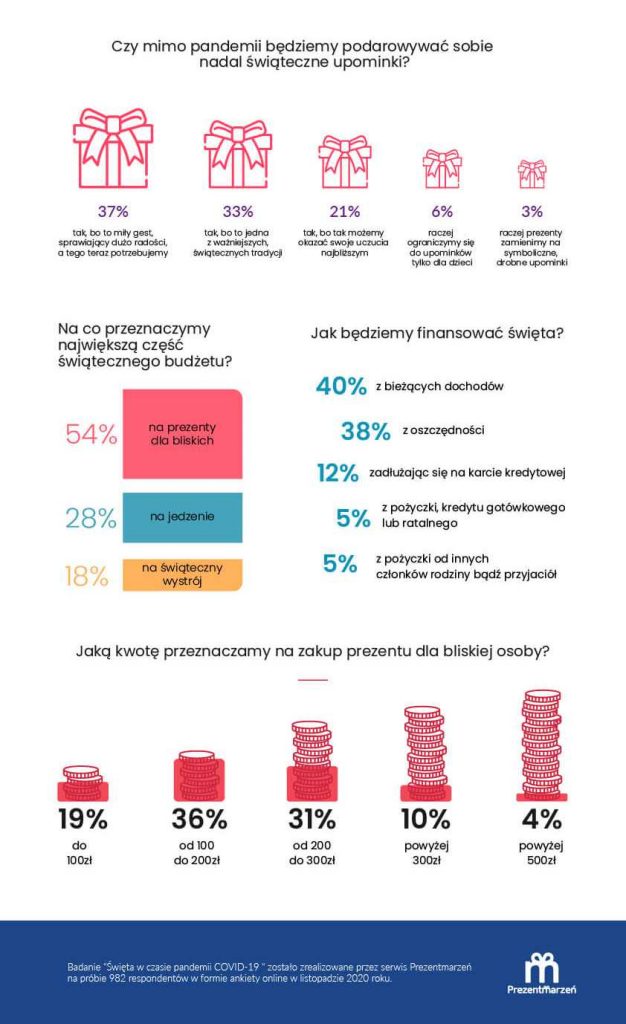 *W materiale prasowym wykorzystano dane z badania „Święta w czasie pandemii COVID-19”. Badanie zostało zrealizowane przez serwis Prezentmarzeń na próbie 982 respondentów w formie ankiety online w listopadzie 2020 roku.